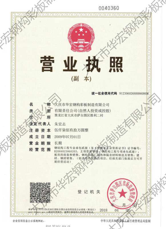 華宏鋼構(gòu)始建于2009年8月9日,總部位于大慶市薩爾圖區(qū)南一路13號,現(xiàn)有大慶市華宏鋼構(gòu)彩板制造有限公司、黑龍江省華宏力安綠建科技有限公司、大慶市華宏鋼構(gòu)彩板制造有限公司長春分公司、黑龍江省海森新材料科技有限公司、大慶市瑞和通螺栓廠五家工業(yè)企業(yè)形成了以彩板復(fù)合板、裝配式鋼結(jié)構(gòu)建筑、保溫材料、配件制造為主的五大生產(chǎn)基地,占地總面積 20余萬平方米,生產(chǎn)車間5萬平方米。中高層管理干部26 人,高級工程師9人,各類國家注冊執(zhí)業(yè)人員 32 人,車間技工 260人,專業(yè)安裝隊伍 10 余支,帶動就業(yè) 500